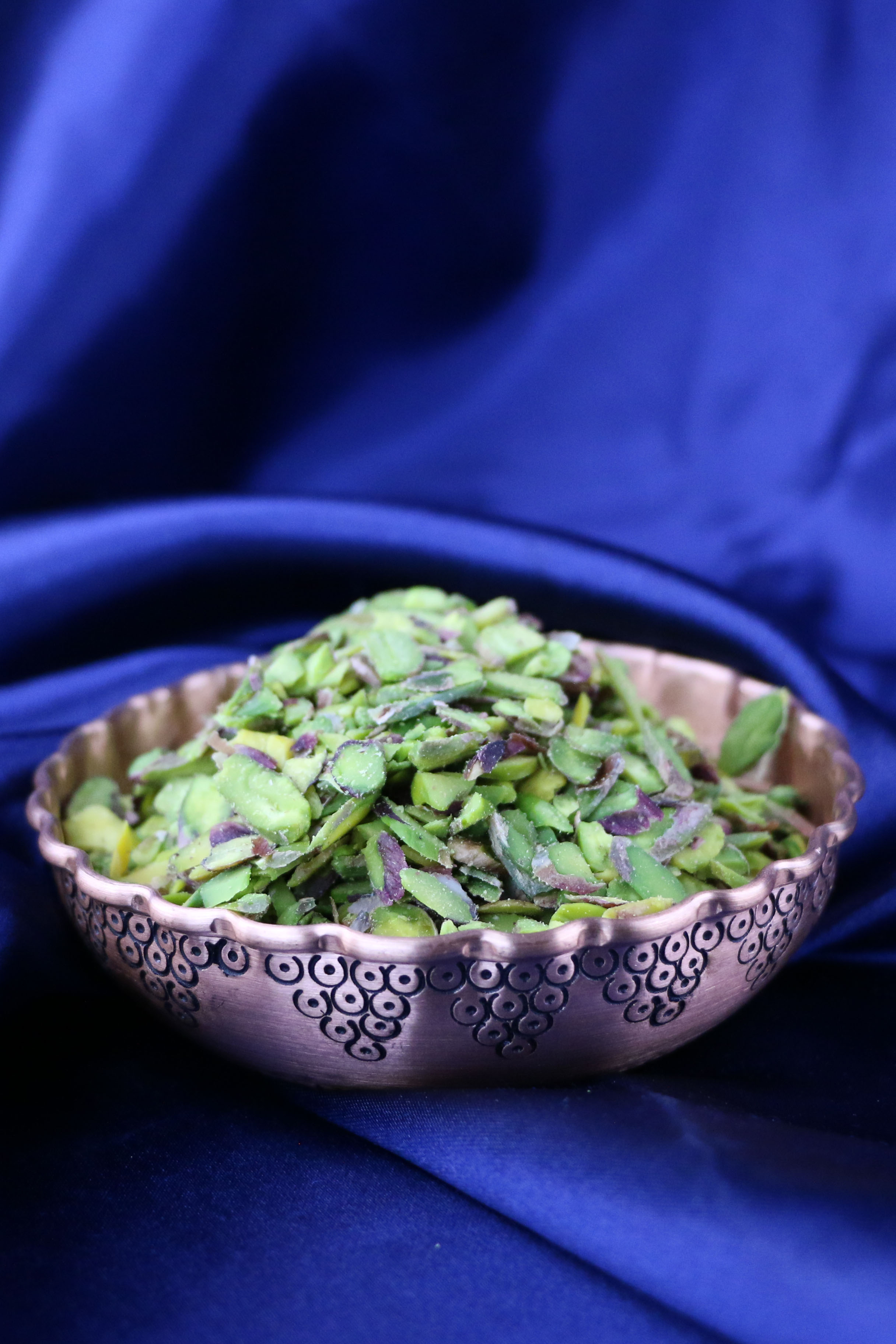 En kaliteli ve iri taneli boz iç Antep fıstıkları, özel tekniklerle kavrulmadan dilimlenerek ince file forma getirilir.