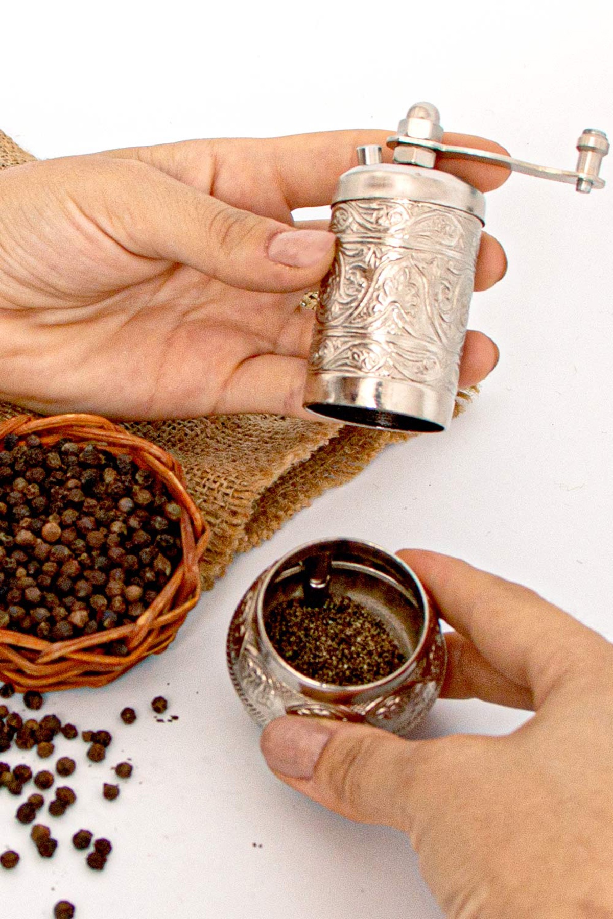 - Gaziantep’in usta bakır işçileri tarafından tamamen el işçiliğiyle üretilen bu Gümüş Bakır Baharat Değirmeni, mutfağınıza hem şıklık hem de fonksiyonellik getirir.